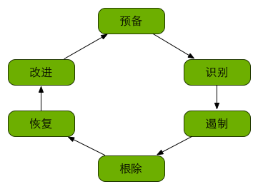 OODA模型相较传统的事件响应六步曲(参见下图),突出了定位和决策的过程,在现今攻击技术越来越高超、过程越来越复杂的形势下,无疑是必要的:针对发现的事件,我们采取怎样的行动,需要有足够的信息和充分的考量。