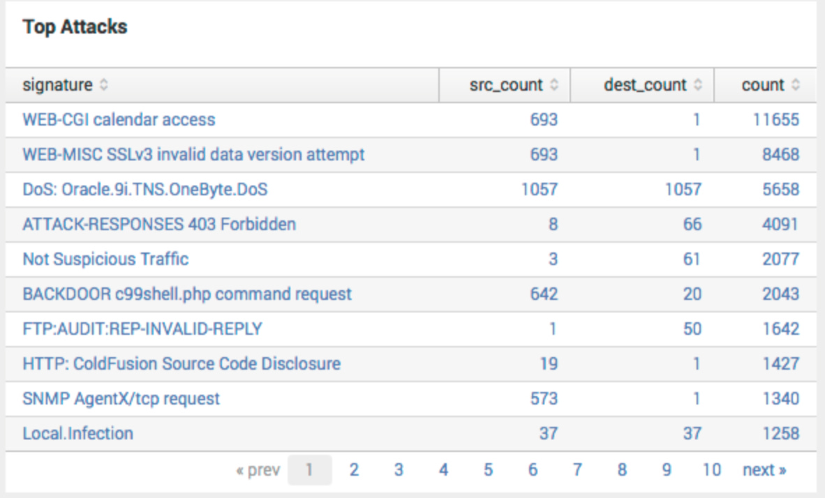这张表是设计用来快速识别误报及需要优先处理的报警的,采用的是典型的TOPN 方式。不难发现这个TOP攻击的表要比我们常见的多了攻击源和目的的计数,因为产生报警数量特别巨大的签名可能是误报,也可能是需要优先处理的,单纯从报警数量上难以做判断,这里加入源和目的的计数,就可以进行初步的判断: