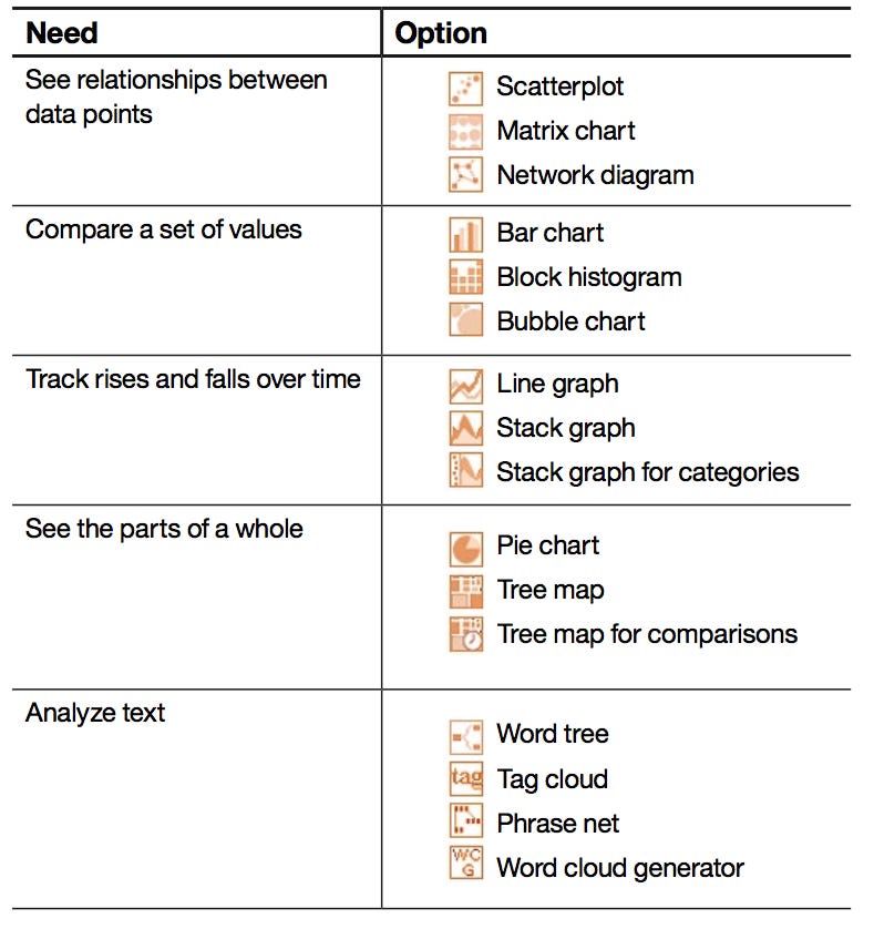 这个方面的知识比较成熟,各种资料和研究各种可视化方法的用途有充分的研究,就如下面从IBM的《Choosing a successful structure for your visualization》一文截取的图表: