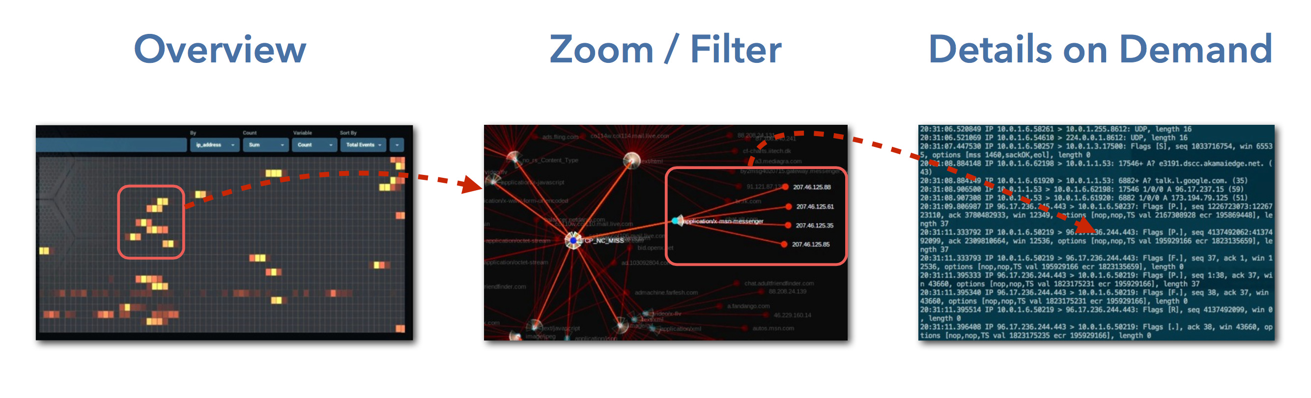 在可视化相关的文章中,树图的发明者,本-施奈德曼教授在其论文《眼见为实》(The Eyes Have It)中这句话最经常被引用“先总览,再缩放并筛选,然后按需寻找细节”,这句话在说明可视化中典型交互模式的同时也没有表明了分析需要良好的交互操作的。Raffael Marty (国际权威的安全数据分析和应用安全可视化专家之一,安天组织的ISF2014中做过首发演讲)对这个模型做了形象化的展示:
