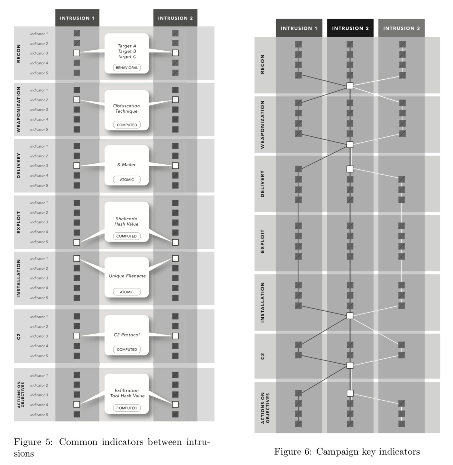 上面入侵重构主要基于杀链的完整分析,而基于多次入侵的横向关联分析则可以识别彼此共性和重叠指标。上升到战略级别,防守方可以识别或定义战役(Campaigns ),将多年的活动与特定的持续威胁联系起来。通过战役分析,可以确定入侵者的模式与行为、技战术以及过程(TTP),旨在检测他们是“如何”操纵的、而不仅仅是他们做了“什么”。对于防守方的价值在于,基于逐个战役评估自身的安全能力,并基于单个战役的风险评估,制定战略行动路线弥补差距。战役分析的另一核心目标在于理解对手的攻击意图和目标,从而可能高度聚焦于针对某个攻击对手或技术的安全措施。 文中抽象出了两种战役分析方法。下图中左边的两次入侵,在杀链各阶段具有高度相关性,通过里面共性指标(白色)可以确认它们同属一个战役。右边的三次入侵,则具有不同程度的关联性。其中相对稳定、保持一致性的白色拐点指标,可被识别为关键指标,也即很大程度在同一战役的后续入侵中会被重复使用到的指标。这于防守方而言是可利用的有利条件。