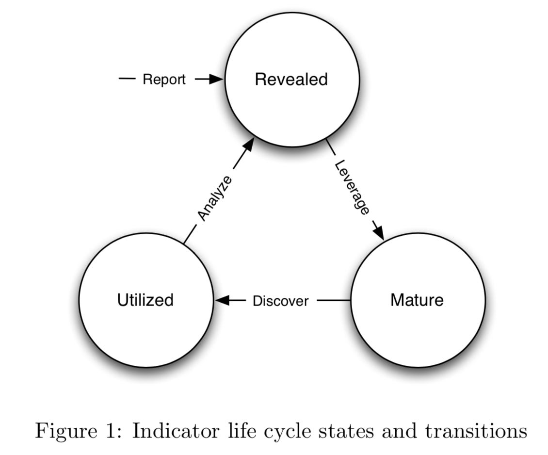 如前所述,情报驱动防御必然是一个持续、迭代过程,分析师通过分析、协同发现指标,将其应用到工具中做进一步完善,再将这些指标用于检测新的入侵活动。在针对这项活动的调查过程中,分析师通常又会获得更多的指标,而这些指标将受到同一套活动和指标状态的约束。这一行动周期和相应的指标状态形成了下图所示的指标生命周期。