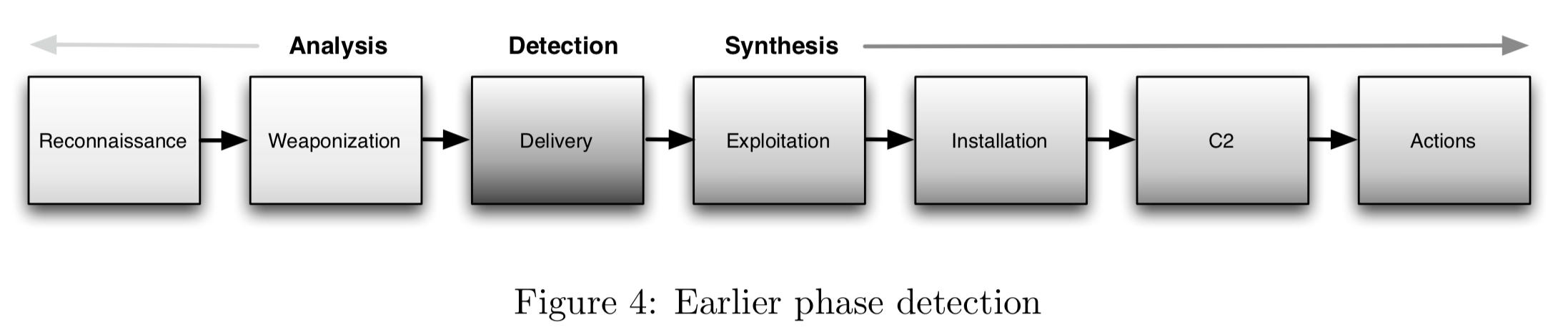 第二种情况,则是指针对失败入侵的分析也同样重要。文中提出了一种叫合成分析(Synthesis)的方法,如下图所示。防守方需要对已检测和防御到的入侵活动、尽可能全面地收集和分析数据,合成出未来入侵中可能绕过当前有效防御机制、在后续阶段采用的技战术。文中举例说明,基于已知指标,阻断掉了一次定向恶意邮件。通过杀链分析,发现在后续阶段会用到新的exploit或者后门。防守方针对该分析结果,比攻击方更快采取措施,则可继续保持战术优势。