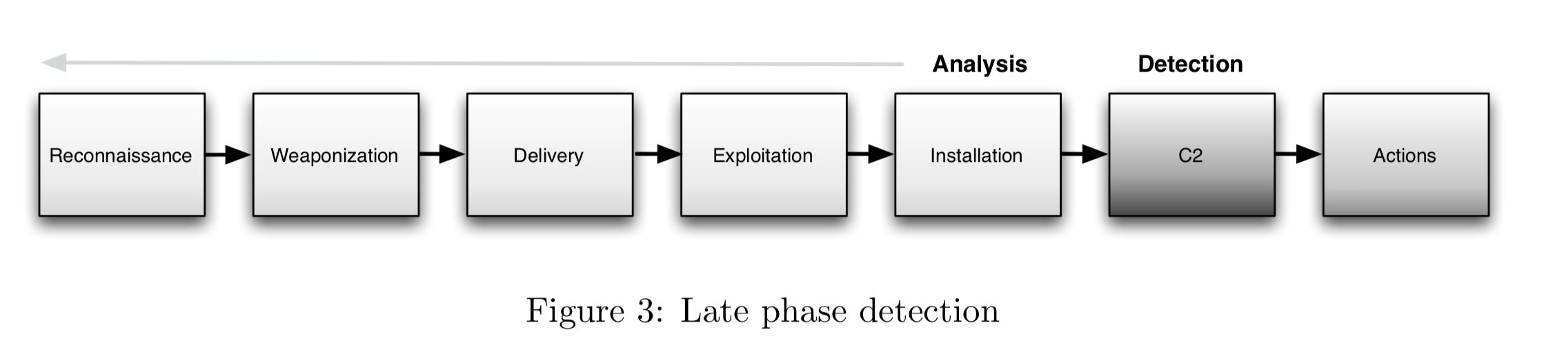 杀链分析用于指导分析师完整地理解入侵过程。在这种新的分析模型下,分析师需要尽可能多地发现每阶段的属性,而不局限于单点信息。文中介绍了两种入侵重构的分析场景例子。一种是检测到入侵后期的活动,分析师需要完成针对之前所有阶段的分析。第二种检测发生在入侵前期,则需要对后续阶段做分析。 第一种情况,如下图所示,在C2控制阶段检测到某次入侵。分析师必须认为攻击者在之前所有阶段都已成功,并需要对此进行还原分析。举例来说,如不能复现入侵的投送阶段,那么就不可能在同一对手下次入侵的投送阶段采取有效的行动。而攻击方考虑经济性,一定会重用工具和架构,防守方在杀链中应用这类情报,将迫使对手在后续入侵中进行调整。