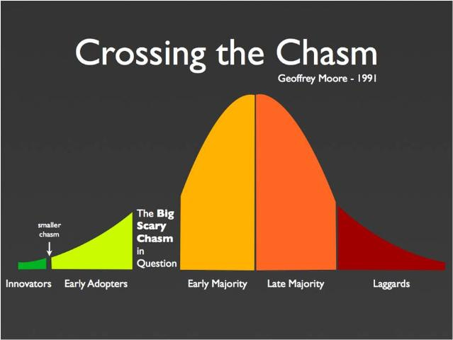 如上图所示,MarketScope适用于市场兴起和高速成长阶段,主要评估市场本身的实力和潜力,并帮助企业根据Gartner对该市场的远景、评估主要的供应商与自身业务需求的匹配度。不同于MQ采用全面、综合的评估体系,MarketScope仅选取产品或技术的关键能力对厂商进行评估。而MQ则适用于高速成长1、巩固以及成熟这3个市场阶段。这些阶段中,市场增长快速、供应商差异化明显。对应《跨越鸿沟》中所描述的技术采用生命周期,MQ研究报告面向的受众主要为市场主流客户,也即早期大众和后期大众。