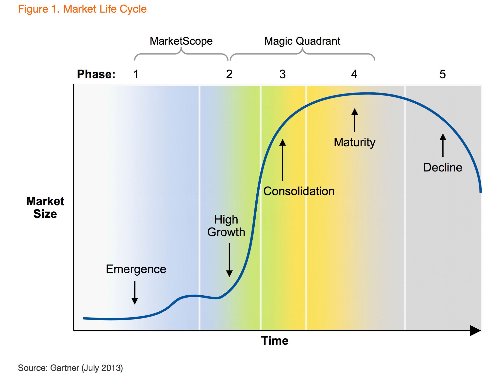 MQ研究报告针对成熟产品市场、面向主流客户,因此对大多数企业参考价值更高。这也是MQ更广为人知和备受关注的原因。考虑市场的成长性和发展阶段,Gartner会采用不同的研究方法评估厂商和市场。参见“How Gartner Evaluate Vendors and Markets in Magic Quadrants and MarketScopes, David Black, Julie Thomas, 2013”一文, Gartner将市场分为5个阶段:兴起、高速成长、巩固、成熟以及衰退。